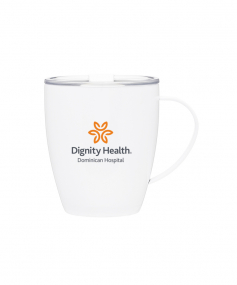 12 oz double wall 18/8 stainless steel thermal mug with copper vacuum insulation, clear acrylic push-on lid, and matching swivel; Hand wash recommended; Do not microwave; 4-7/16" h x 4"w (4-7/8 with handle) ; 355mL.