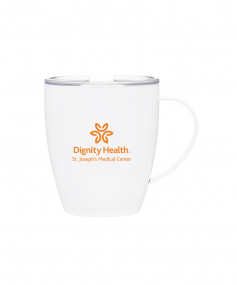 12 oz double wall 18/8 stainless steel thermal mug with copper vacuum insulation, clear acrylic push-on lid, and matching swivel; Hand wash recommended; Do not microwave; 4-7/16" h x 4"w (4-7/8 with handle) ; 355mL.