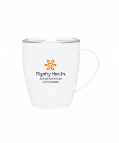 12 oz double wall 18/8 stainless steel thermal mug with copper vacuum insulation, clear acrylic push-on lid, and matching swivel; Hand wash recommended; Do not microwave; 4-7/16" h x 4"w (4-7/8 with handle) ; 355mL.