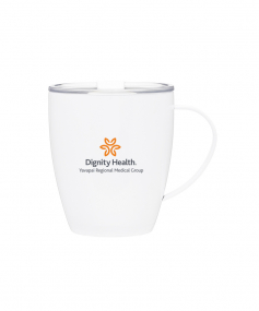 12 oz double wall 18/8 stainless steel thermal mug with copper vacuum insulation, clear acrylic push-on lid, and matching swivel; Hand wash recommended; Do not microwave; 4-7/16" h x 4"w (4-7/8 with handle) ; 355mL.