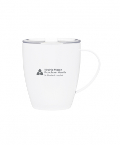 12 oz double wall 18/8 stainless steel thermal mug with copper vacuum insulation, clear acrylic push-on lid, and matching swivel; Hand wash recommended; Do not microwave; 4-7/16" h x 4"w (4-7/8 with handle) ; 355mL.