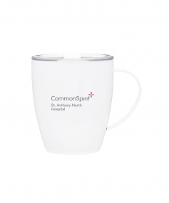 12 oz double wall 18/8 stainless steel thermal mug with copper vacuum insulation, clear acrylic push-on lid, and matching swivel; Hand wash recommended; Do not microwave; 4-7/16" h x 4"w (4-7/8 with handle) ; 355mL.
