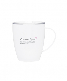 12 oz double wall 18/8 stainless steel thermal mug with copper vacuum insulation, clear acrylic push-on lid, and matching swivel; Hand wash recommended; Do not microwave; 4-7/16" h x 4"w (4-7/8 with handle) ; 355mL.