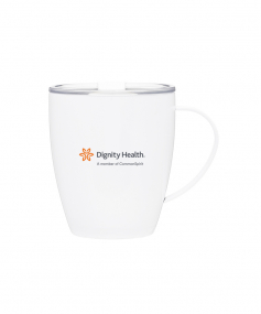 12 oz double wall 18/8 stainless steel thermal mug with copper vacuum insulation, clear acrylic push-on lid, and matching swivel; Hand wash recommended; Do not microwave; 4-7/16" h x 4"w (4-7/8 with handle) ; 355mL.