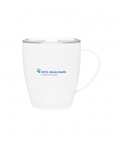12 oz double wall 18/8 stainless steel thermal mug with copper vacuum insulation, clear acrylic push-on lid, and matching swivel; Hand wash recommended; Do not microwave; 4-7/16" h x 4"w (4-7/8 with handle) ; 355mL.