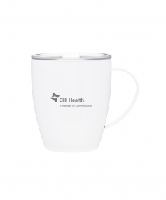 12 oz double wall 18/8 stainless steel thermal mug with copper vacuum insulation, clear acrylic push-on lid, and matching swivel; Hand wash recommended; Do not microwave; 4-7/16" h x 4"w (4-7/8 with handle) ; 355mL.