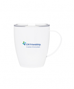 12 oz double wall 18/8 stainless steel thermal mug with copper vacuum insulation, clear acrylic push-on lid, and matching swivel; Hand wash recommended; Do not microwave; 4-7/16" h x 4"w (4-7/8 with handle) ; 355mL.