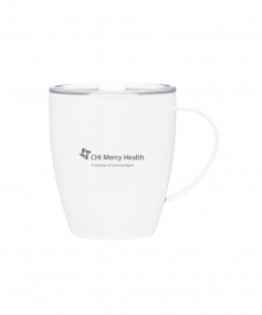12 oz double wall 18/8 stainless steel thermal mug with copper vacuum insulation, clear acrylic push-on lid, and matching swivel; Hand wash recommended; Do not microwave; 4-7/16" h x 4"w (4-7/8 with handle) ; 355mL.