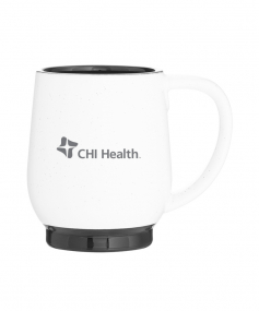 12 oz stoneware: matte white out / glossy color in with speckles and colored base. Hand wash recommended. Do not microwave with metallic imprint (glitz). Complies with FDA, Prop 65. 4.4375" H x 3.625" W