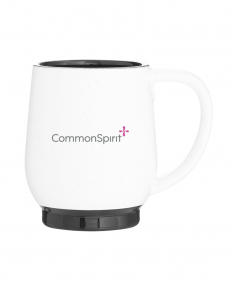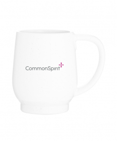 12 oz stoneware: matte white out / glossy color in with speckles and colored base. Hand wash recommended. Do not microwave with metallic imprint (glitz). Complies with FDA, Prop 65. 4.4375" H x 3.625" W