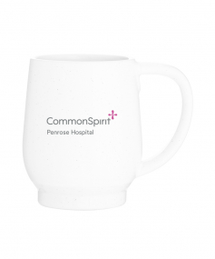 12 oz stoneware: matte white out / glossy color in with speckles and colored base. Hand wash recommended. Do not microwave with metallic imprint (glitz). Complies with FDA, Prop 65. 4.4375" H x 3.625" W