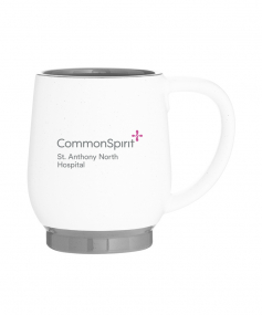 12 oz stoneware: matte white out / glossy color in with speckles and colored base. Hand wash recommended. Do not microwave with metallic imprint (glitz). Complies with FDA, Prop 65. 4.4375" H x 3.625" W