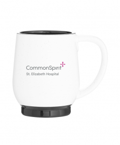 12 oz stoneware: matte white out / glossy color in with speckles and colored base. Hand wash recommended. Do not microwave with metallic imprint (glitz). Complies with FDA, Prop 65. 4.4375" H x 3.625" W