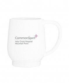 12 oz stoneware: matte white out / glossy color in with speckles and colored base. Hand wash recommended. Do not microwave with metallic imprint (glitz). Complies with FDA, Prop 65. 4.4375" H x 3.625" W