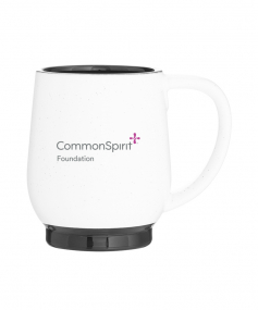 12 oz stoneware: matte white out / glossy color in with speckles and colored base. Hand wash recommended. Do not microwave with metallic imprint (glitz). Complies with FDA, Prop 65. 4.4375" H x 3.625" W