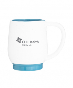 12 oz stoneware: matte white out / glossy color in with speckles and colored base. Hand wash recommended. Do not microwave with metallic imprint (glitz). Complies with FDA, Prop 65. 4.4375" H x 3.625" W