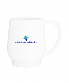 12 oz stoneware: matte white out / glossy color in with speckles and colored base. Hand wash recommended. Do not microwave with metallic imprint (glitz). Complies with FDA, Prop 65. 4.4375" H x 3.625" W