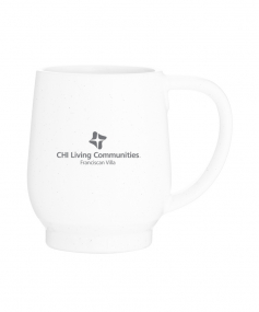 12 oz stoneware: matte white out / glossy color in with speckles and colored base. Hand wash recommended. Do not microwave with metallic imprint (glitz). Complies with FDA, Prop 65. 4.4375" H x 3.625" W