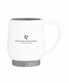 12 oz stoneware: matte white out / glossy color in with speckles and colored base. Hand wash recommended. Do not microwave with metallic imprint (glitz). Complies with FDA, Prop 65. 4.4375" H x 3.625" W