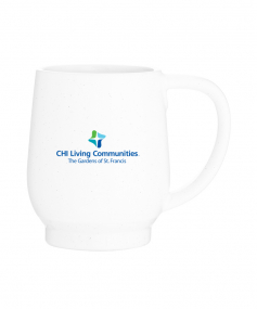 12 oz stoneware: matte white out / glossy color in with speckles and colored base. Hand wash recommended. Do not microwave with metallic imprint (glitz). Complies with FDA, Prop 65. 4.4375" H x 3.625" W
