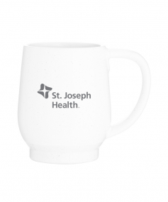 12 oz stoneware: matte white out / glossy color in with speckles and colored base. Hand wash recommended. Do not microwave with metallic imprint (glitz). Complies with FDA, Prop 65. 4.4375" H x 3.625" W