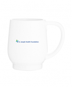 12 oz stoneware: matte white out / glossy color in with speckles and colored base. Hand wash recommended. Do not microwave with metallic imprint (glitz). Complies with FDA, Prop 65. 4.4375" H x 3.625" W