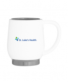 12 oz stoneware: matte white out / glossy color in with speckles and colored base. Hand wash recommended. Do not microwave with metallic imprint (glitz). Complies with FDA, Prop 65. 4.4375" H x 3.625" W