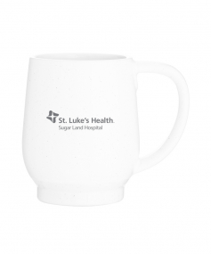 12 oz stoneware: matte white out / glossy color in with speckles and colored base. Hand wash recommended. Do not microwave with metallic imprint (glitz). Complies with FDA, Prop 65. 4.4375" H x 3.625" W