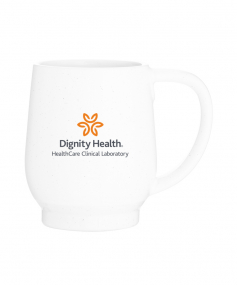 12 oz stoneware: matte white out / glossy color in with speckles and colored base. Hand wash recommended. Do not microwave with metallic imprint (glitz). Complies with FDA, Prop 65. 4.4375" H x 3.625" W