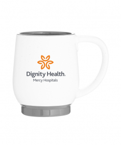 12 oz stoneware: matte white out / glossy color in with speckles and colored base. Hand wash recommended. Do not microwave with metallic imprint (glitz). Complies with FDA, Prop 65. 4.4375" H x 3.625" W