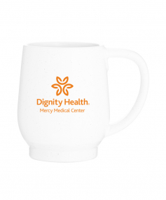 12 oz stoneware: matte white out / glossy color in with speckles and colored base. Hand wash recommended. Do not microwave with metallic imprint (glitz). Complies with FDA, Prop 65. 4.4375" H x 3.625" W