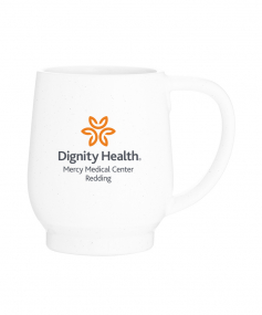 12 oz stoneware: matte white out / glossy color in with speckles and colored base. Hand wash recommended. Do not microwave with metallic imprint (glitz). Complies with FDA, Prop 65. 4.4375" H x 3.625" W