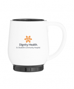 12 oz stoneware: matte white out / glossy color in with speckles and colored base. Hand wash recommended. Do not microwave with metallic imprint (glitz). Complies with FDA, Prop 65. 4.4375" H x 3.625" W