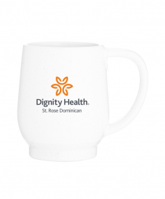 12 oz stoneware: matte white out / glossy color in with speckles and colored base. Hand wash recommended. Do not microwave with metallic imprint (glitz). Complies with FDA, Prop 65. 4.4375" H x 3.625" W