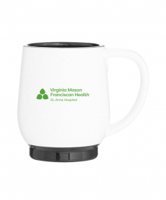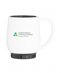 12 oz stoneware: matte white out / glossy color in with speckles and colored base. Hand wash recommended. Do not microwave with metallic imprint (glitz). Complies with FDA, Prop 65. 4.4375" H x 3.625" W