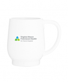 12 oz stoneware: matte white out / glossy color in with speckles and colored base. Hand wash recommended. Do not microwave with metallic imprint (glitz). Complies with FDA, Prop 65. 4.4375" H x 3.625" W