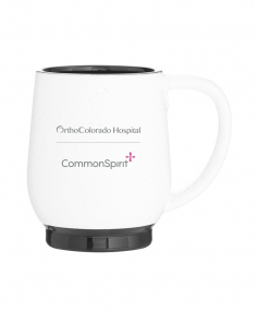 12 oz stoneware: matte white out / glossy color in with speckles and colored base. Hand wash recommended. Do not microwave with metallic imprint (glitz). Complies with FDA, Prop 65. 4.4375" H x 3.625" W