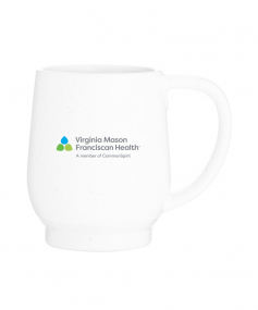 12 oz stoneware: matte white out / glossy color in with speckles and colored base. Hand wash recommended. Do not microwave with metallic imprint (glitz). Complies with FDA, Prop 65. 4.4375" H x 3.625" W
