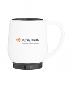 12 oz stoneware: matte white out / glossy color in with speckles and colored base. Hand wash recommended. Do not microwave with metallic imprint (glitz). Complies with FDA, Prop 65. 4.4375" H x 3.625" W