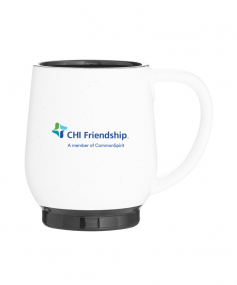 12 oz stoneware: matte white out / glossy color in with speckles and colored base. Hand wash recommended. Do not microwave with metallic imprint (glitz). Complies with FDA, Prop 65. 4.4375" H x 3.625" W