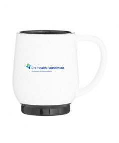 12 oz stoneware: matte white out / glossy color in with speckles and colored base. Hand wash recommended. Do not microwave with metallic imprint (glitz). Complies with FDA, Prop 65. 4.4375" H x 3.625" W