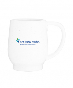 12 oz stoneware: matte white out / glossy color in with speckles and colored base. Hand wash recommended. Do not microwave with metallic imprint (glitz). Complies with FDA, Prop 65. 4.4375" H x 3.625" W