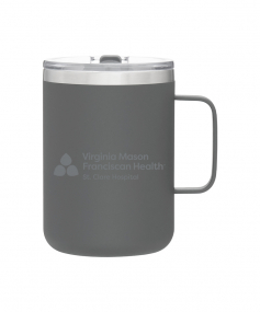 16.9 oz double wall 18/8 stainless steel thermal mug with copper vacuum insulation, stainless steel rim, clear push-on lid with matching swivel closure, and powder coated finish. Individual gift bo
