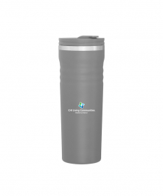 16.9 oz double wall tumbler with 18/8 stainless steel inner wall, stainless steel outer wall, vacuum insulation, push-on lid, swivel closure, stainless steel rim, and powder coated finish