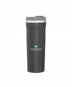 16.9 oz double wall tumbler with 18/8 stainless steel inner wall, stainless steel outer wall, vacuum insulation, push-on lid, swivel closure, stainless steel rim, and powder coated finish