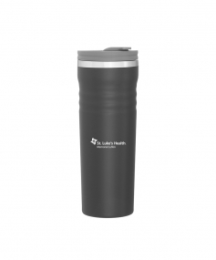 16.9 oz double wall tumbler with 18/8 stainless steel inner wall, stainless steel outer wall, vacuum insulation, push-on lid, swivel closure, stainless steel rim, and powder coated finish