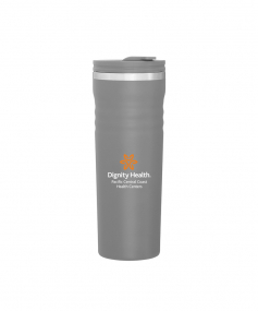 16.9 oz double wall tumbler with 18/8 stainless steel inner wall, stainless steel outer wall, vacuum insulation, push-on lid, swivel closure, stainless steel rim, and powder coated finish