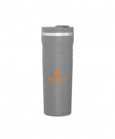 16.9 oz double wall tumbler with 18/8 stainless steel inner wall, stainless steel outer wall, vacuum insulation, push-on lid, swivel closure, stainless steel rim, and powder coated finish