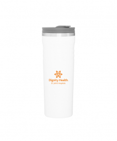 16.9 oz double wall tumbler with 18/8 stainless steel inner wall, stainless steel outer wall, vacuum insulation, push-on lid, swivel closure, stainless steel rim, and powder coated finish