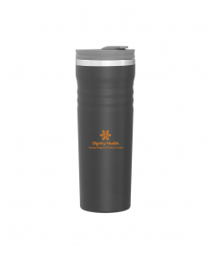 16.9 oz double wall tumbler with 18/8 stainless steel inner wall, stainless steel outer wall, vacuum insulation, push-on lid, swivel closure, stainless steel rim, and powder coated finish